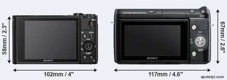 If the front view area (width x height) of the cameras is taken as an aggregate measure of their size, the Sony NEX-F3 is notably larger (33 percent) than the Sony HX99. In this context, it is worth noting that neither the HX99 nor the NEX-F3 are weather-sealed.