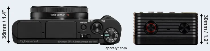 The physical size and weight of the Sony HX99 and the Sony RX0 are illustrated in the side-by-side display below. The two cameras are presented according to their relative size. Three consecutive perspectives from the front, the top, and the back are available. All width, height and depth measures are rounded to the nearest millimeter.