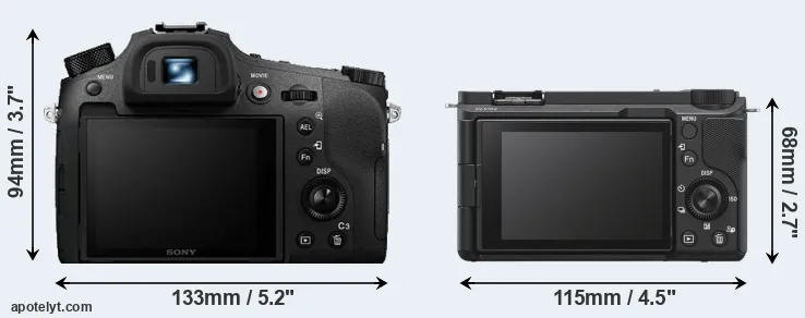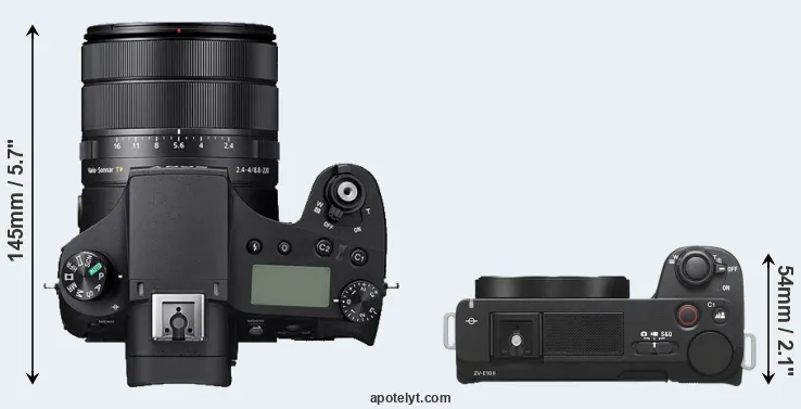 The side-by-side display below illustrates the physical size and weight of the Sony RX10 IV and the Sony ZV-E10 II. The two cameras are presented according to their relative size. Three consecutive views from the front, the top, and the rear side are shown. All width, height and depth dimensions are rounded to the nearest millimeter.