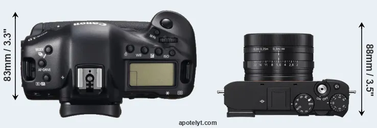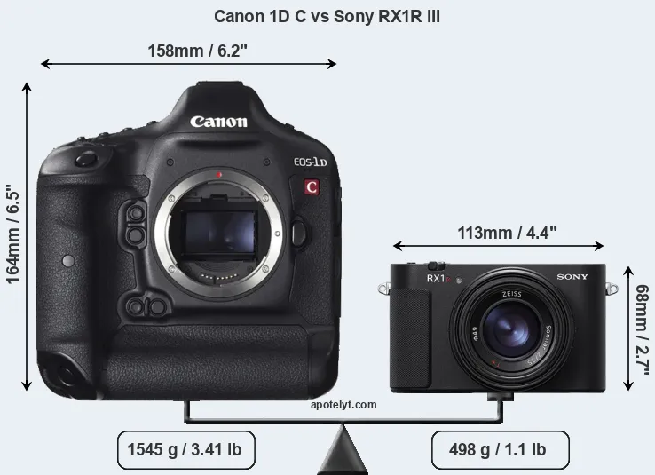 Die Canon EOS-1D C und die Sony Cyber-shot DSC-RX1R III sind zwei digitale Kameras, die im April 2012 beziehungsweise im Juli 2025 vorgestellt wurden. Die 1DC is eine eine digitale Spiegelreflexkamera, während es sich bei der RX1R III um eine Kompaktkamera mit integriertem Objektiv handelt. Beide Kameras sind mit einem Vollformatsensor ausgerüstet. Die Canon hat eine Auflösung von 17,9 Megapixel, während die Sony 60,2 MP bietet.