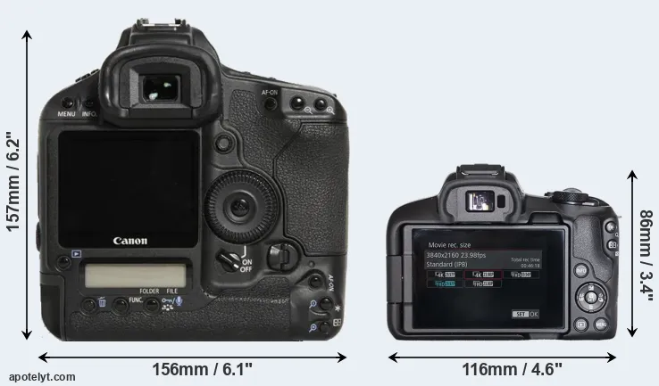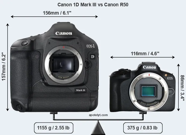 Die physische Größe und das Gewicht der Canon 1D Mark III und der Canon R50 werden in der nachfolgenden Graphik illustriert. Die beiden Kameras werden entsprechend ihrer relativen Größe dargestellt. Alle Größenangaben sind auf den nächsten Millimeter gerundet.