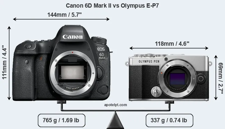 Die physische Größe und das Gewicht der Canon 6D Mark II und der Olympus E-P7 werden in der nachfolgenden Graphik illustriert. Die beiden Kameras werden entsprechend ihrer relativen Größe dargestellt. Alle Größenangaben sind auf den nächsten Millimeter gerundet.