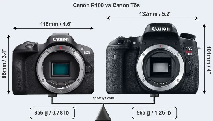 Die physische Größe und das Gewicht der Canon R100 und der Canon T6s werden in der nachfolgenden Graphik illustriert. Die beiden Kameras werden entsprechend ihrer relativen Größe dargestellt. Alle Größenangaben sind auf den nächsten Millimeter gerundet.