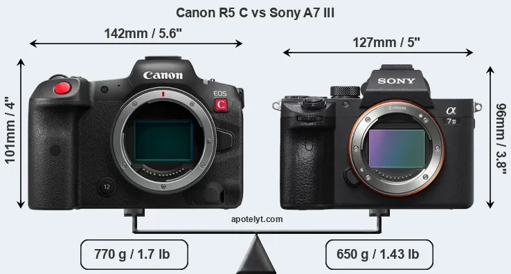 Die physische Größe und das Gewicht der Canon R5 C und der Sony A7 III werden in der nachfolgenden Graphik illustriert. Die beiden Kameras werden entsprechend ihrer relativen Größe dargestellt. Alle Größenangaben sind auf den nächsten Millimeter gerundet.