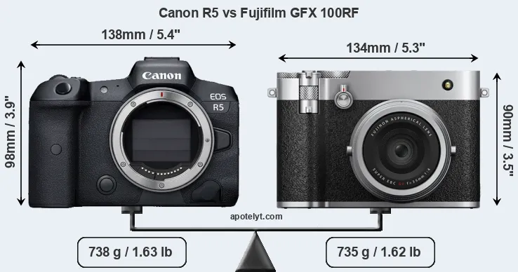 Die physische Größe und das Gewicht der Canon R5 und der Fujifilm GFX 100RF werden in der nachfolgenden Graphik illustriert. Die beiden Kameras werden entsprechend ihrer relativen Größe dargestellt. Alle Größenangaben sind auf den nächsten Millimeter gerundet.