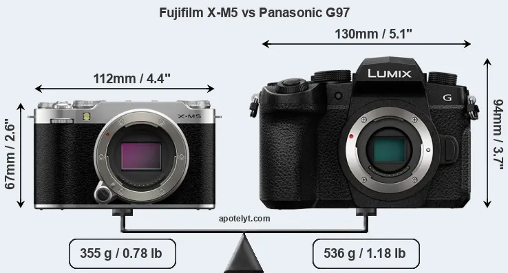 Die physische Größe und das Gewicht der Fujifilm X-M5 und der Panasonic G97 werden in der nachfolgenden Graphik illustriert. Die beiden Kameras werden entsprechend ihrer relativen Größe dargestellt. Alle Größenangaben sind auf den nächsten Millimeter gerundet.