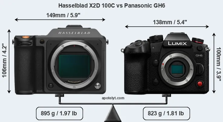 Die physische Größe und das Gewicht der Hasselblad X2D 100C und der Panasonic GH6 werden in der nachfolgenden Graphik illustriert. Die beiden Kameras werden entsprechend ihrer relativen Größe dargestellt. Alle Größenangaben sind auf den nächsten Millimeter gerundet.