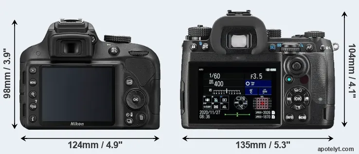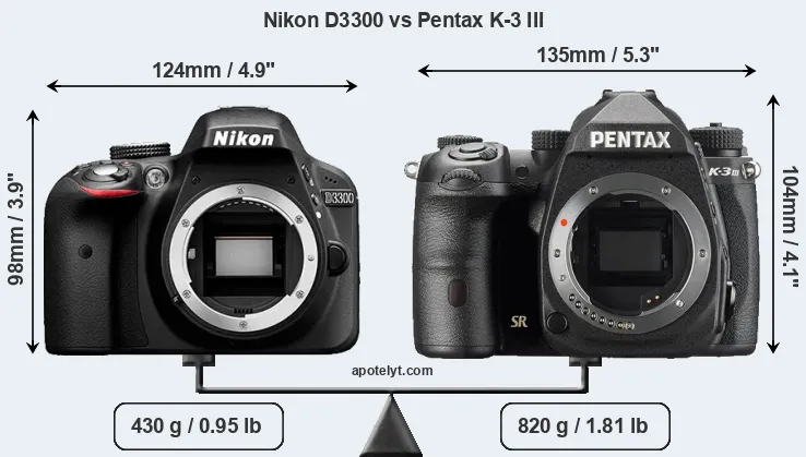 Die physische Größe und das Gewicht der Nikon D3300 und der Pentax K-3 III werden in der nachfolgenden Graphik illustriert. Die beiden Kameras werden entsprechend ihrer relativen Größe dargestellt. Alle Größenangaben sind auf den nächsten Millimeter gerundet.