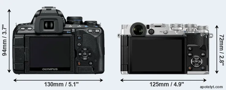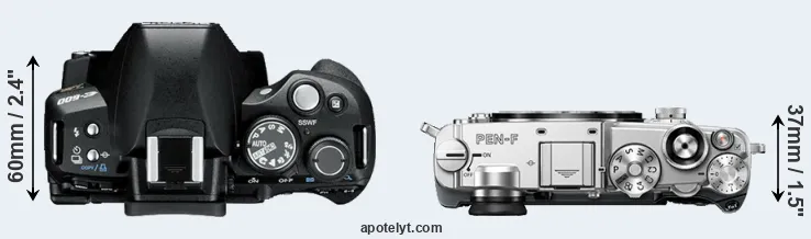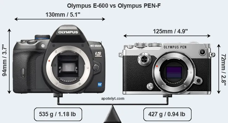 Die physische Größe und das Gewicht der Olympus E-600 und der Olympus PEN-F werden in der nachfolgenden Graphik illustriert. Die beiden Kameras werden entsprechend ihrer relativen Größe dargestellt. Alle Größenangaben sind auf den nächsten Millimeter gerundet.