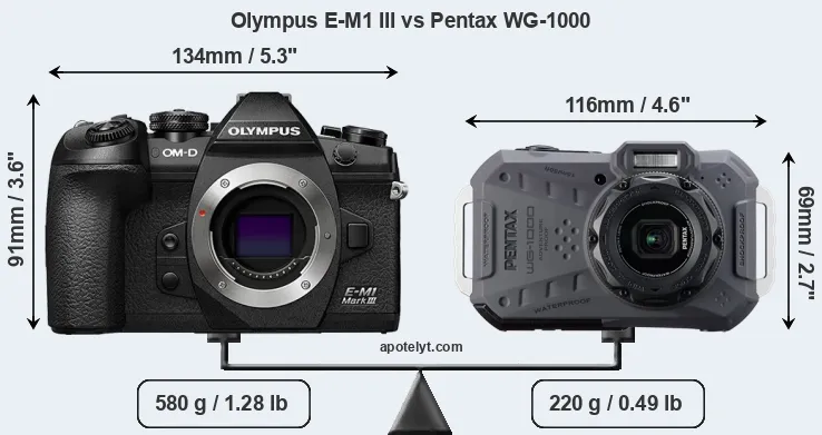 Die physische Größe und das Gewicht der Olympus E-M1 III und der Pentax WG-1000 werden in der nachfolgenden Graphik illustriert. Die beiden Kameras werden entsprechend ihrer relativen Größe dargestellt. Alle Größenangaben sind auf den nächsten Millimeter gerundet.