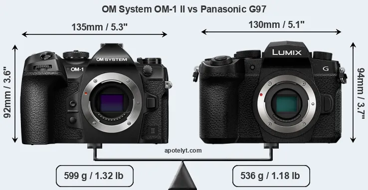 Die physische Größe und das Gewicht der OM System OM-1 II und der Panasonic G97 werden in der nachfolgenden Graphik illustriert. Die beiden Kameras werden entsprechend ihrer relativen Größe dargestellt. Alle Größenangaben sind auf den nächsten Millimeter gerundet.
