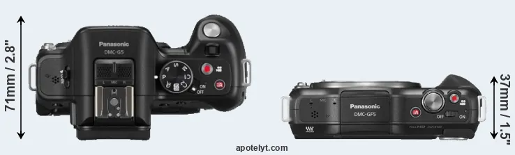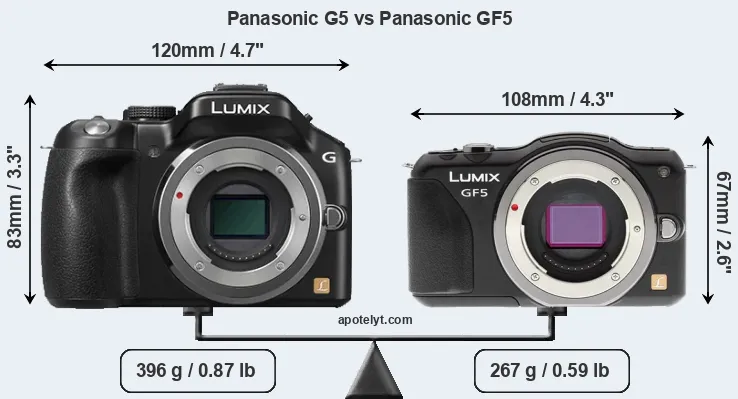 Die physische Größe und das Gewicht der Panasonic G5 und der Panasonic GF5 werden in der nachfolgenden Graphik illustriert. Die beiden Kameras werden entsprechend ihrer relativen Größe dargestellt. Alle Größenangaben sind auf den nächsten Millimeter gerundet.