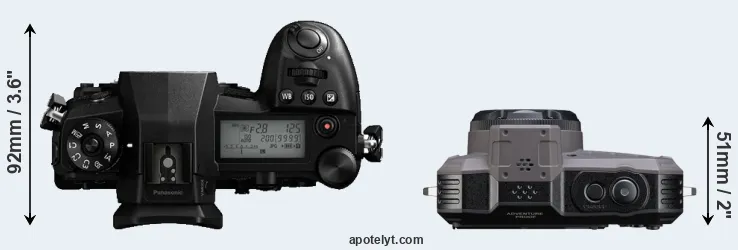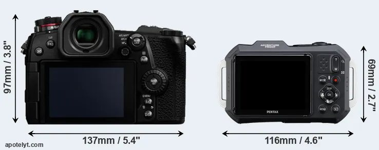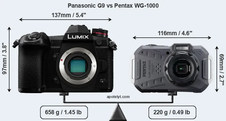 Die physische Größe und das Gewicht der Panasonic G9 und der Pentax WG-1000 werden in der nachfolgenden Graphik illustriert. Die beiden Kameras werden entsprechend ihrer relativen Größe dargestellt. Alle Größenangaben sind auf den nächsten Millimeter gerundet.