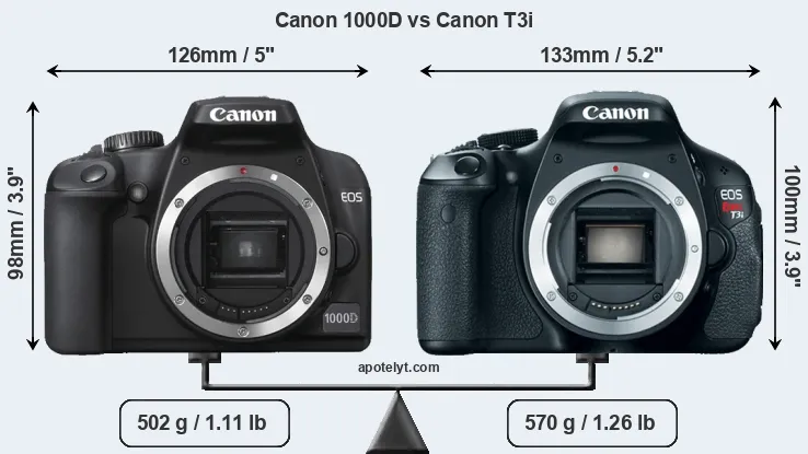 El tamaño físico y el peso de Canon 1000D y Canon T3i se ilustran en el siguiente gráfico. Las dos cámaras se muestran según su tamaño relativo. Todas las dimensiones están redondeadas al milímetro más cercano.