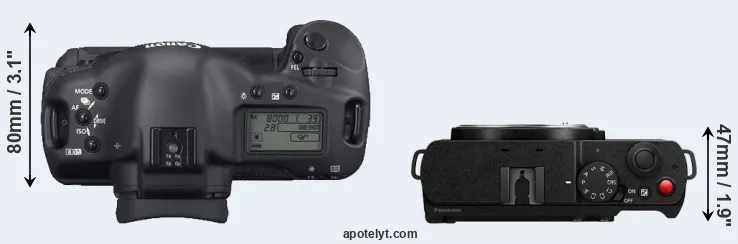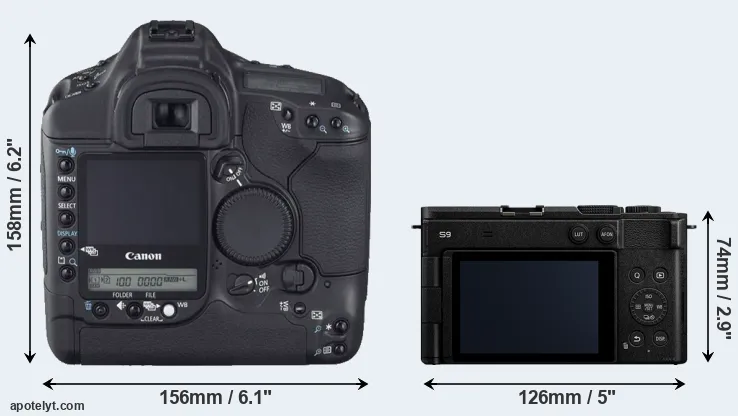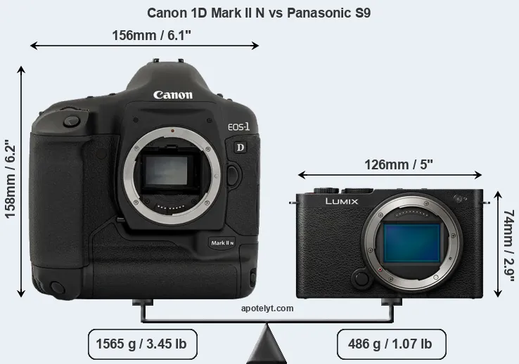 El tamaño físico y el peso de Canon 1D Mark II N y Panasonic S9 se ilustran en el siguiente gráfico. Las dos cámaras se muestran según su tamaño relativo. Todas las dimensiones están redondeadas al milímetro más cercano.