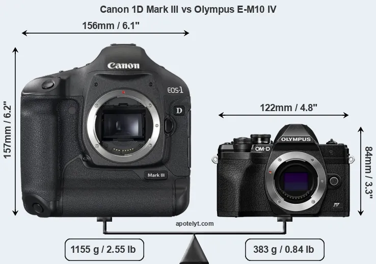 El tamaño físico y el peso de Canon 1D Mark III y Olympus E-M10 IV se ilustran en el siguiente gráfico. Las dos cámaras se muestran según su tamaño relativo. Todas las dimensiones están redondeadas al milímetro más cercano.