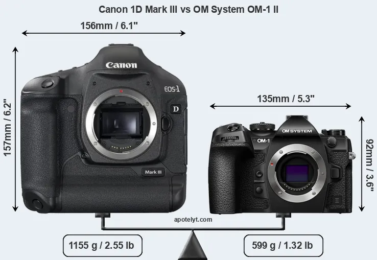 El tamaño físico y el peso de Canon 1D Mark III y OM System OM-1 II se ilustran en el siguiente gráfico. Las dos cámaras se muestran según su tamaño relativo. Todas las dimensiones están redondeadas al milímetro más cercano.