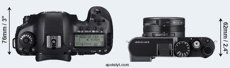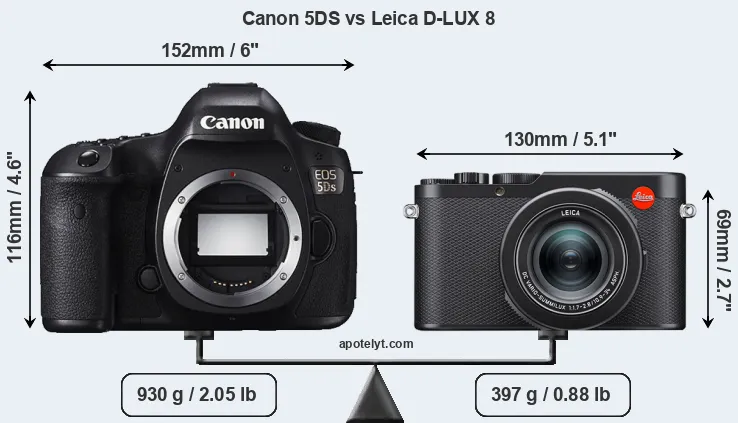 El tamaño físico y el peso de Canon 5DS y Leica D-LUX 8 se ilustran en el siguiente gráfico. Las dos cámaras se muestran según su tamaño relativo. Todas las dimensiones están redondeadas al milímetro más cercano.
