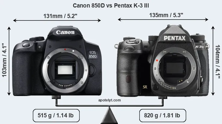 El tamaño físico y el peso de Canon 850D y Pentax K-3 III se ilustran en el siguiente gráfico. Las dos cámaras se muestran según su tamaño relativo. Todas las dimensiones están redondeadas al milímetro más cercano.