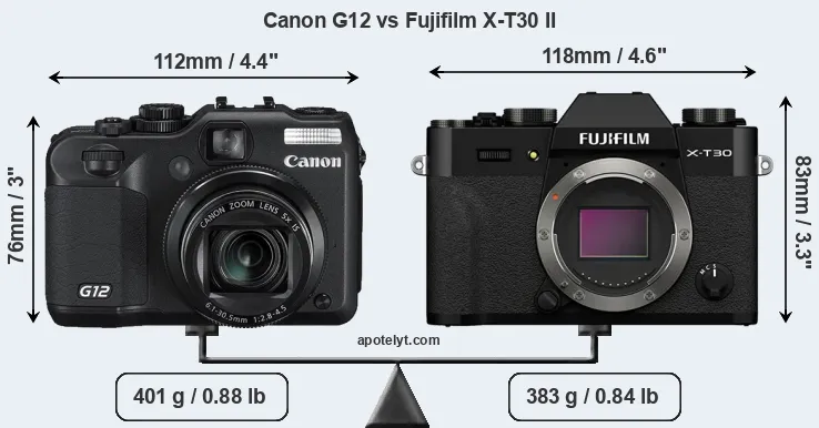 El tamaño físico y el peso de Canon G12 y Fujifilm X-T30 II se ilustran en el siguiente gráfico. Las dos cámaras se muestran según su tamaño relativo. Todas las dimensiones están redondeadas al milímetro más cercano.