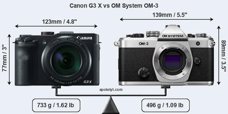 El tamaño físico y el peso de Canon G3 X y OM System OM-3 se ilustran en el siguiente gráfico. Las dos cámaras se muestran según su tamaño relativo. Todas las dimensiones están redondeadas al milímetro más cercano.