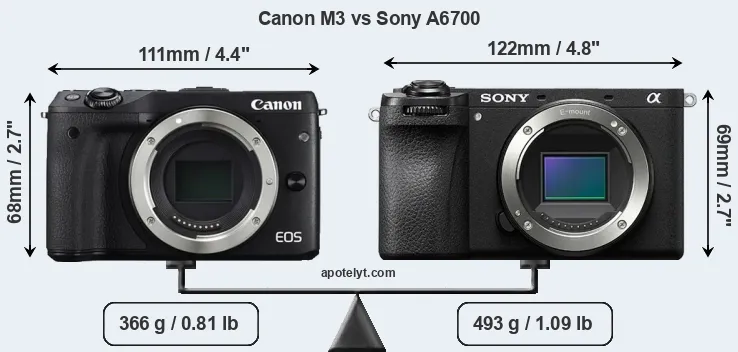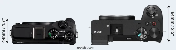 El tamaño físico y el peso de Canon M3 y Sony A6700 se ilustran en el siguiente gráfico. Las dos cámaras se muestran según su tamaño relativo. Todas las dimensiones están redondeadas al milímetro más cercano.