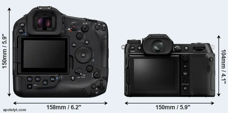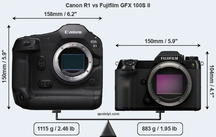 La Canon EOS R1 y la Fujifilm GFX 100S II son dos cámaras digitales que fueron reveladas al público, respectivamente, en julio de 2024 y mayo de 2024. Ambas son cámaras cámara de objectivos intercambiables sin espejo, que están equipados con un sensor de fotograma completo (R1) y un sensor de formato medio (GFX 100S II). La Canon tiene una resolución de 24,0 megapíxeles, mientras que la Fujifilm proporciona 101,8 MP.