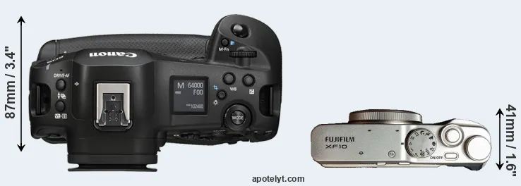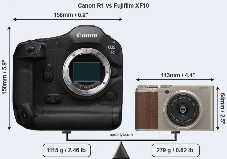 El tamaño físico y el peso de Canon R1 y Fujifilm XF10 se ilustran en el siguiente gráfico. Las dos cámaras se muestran según su tamaño relativo. Todas las dimensiones están redondeadas al milímetro más cercano.