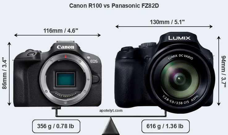 Más allá de esta instantánea de las funciones y características principales, ¿cuáles son las diferencias entre la Canon EOS R100 y la Panasonic Lumix DC-FZ82D? ¿Cuál camara deberías comprar? Siga leyendo para descubrir cómo se comparan estas dos cámaras con respecto al tamaño de su cuerpo y otras caracteristicas.