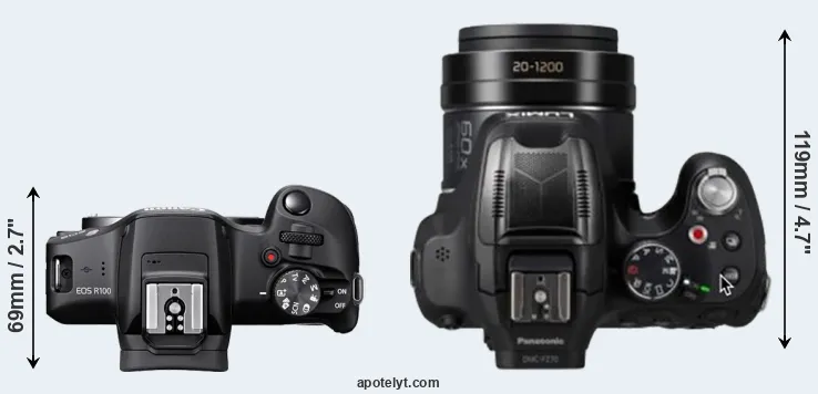 La Canon EOS R100 y la Panasonic Lumix DC-FZ82D son dos cámaras digitales que fueron reveladas al público, respectivamente, en mayo de 2023 y julio de 2024. La R100 es una cámara de objectivos intercambiables sin espejo, mientras que la FZ82D es una cámara compacta con objectivo incorporada. Las cámaras son equipados con un sensor de fotograma APS-C (R100) y un sensor de 1/2,3 pulgada (FZ82D). La Canon tiene una resolución de 24,0 megapíxeles, mientras que la Panasonic proporciona 18,0 MP.
