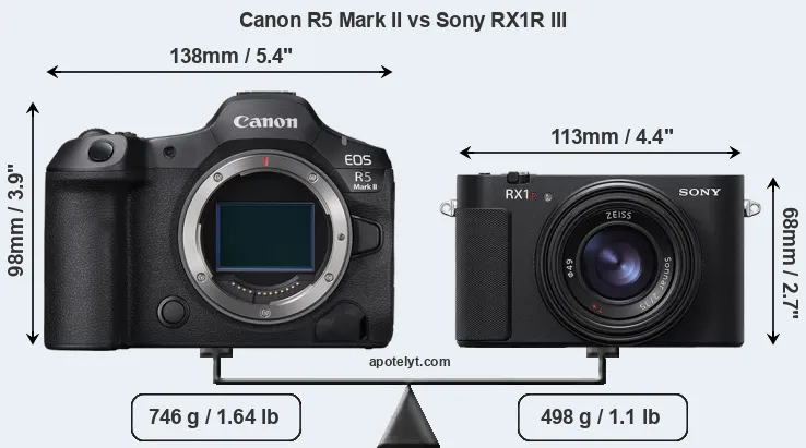 La Canon EOS R5 Mark II y la Sony Cyber-shot DSC-RX1R III son dos cámaras digitales que fueron reveladas al público, respectivamente, en julio de 2024 y julio de 2025. La R5 Mark II es una cámara de objectivos intercambiables sin espejo, mientras que la RX1R III es una cámara compacta con objectivo incorporada. Ambas cámaras están equipados con un sensor de fotograma completo. La Canon tiene una resolución de 44,8 megapíxeles, mientras que la Sony proporciona 60,2 MP.