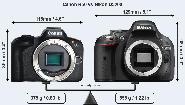 El tamaño físico y el peso de Canon R50 y Nikon D5200 se ilustran en el siguiente gráfico. Las dos cámaras se muestran según su tamaño relativo. Todas las dimensiones están redondeadas al milímetro más cercano.