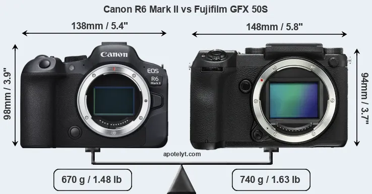 El tamaño físico y el peso de Canon R6 Mark II y Fujifilm GFX 50S se ilustran en el siguiente gráfico. Las dos cámaras se muestran según su tamaño relativo. Todas las dimensiones están redondeadas al milímetro más cercano.