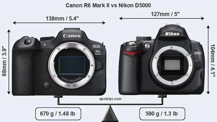 El tamaño físico y el peso de Canon R6 Mark II y Nikon D5000 se ilustran en el siguiente gráfico. Las dos cámaras se muestran según su tamaño relativo. Todas las dimensiones están redondeadas al milímetro más cercano.