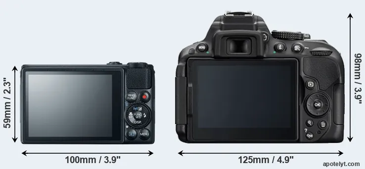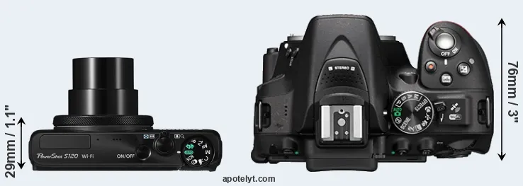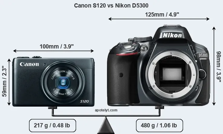 El tamaño físico y el peso de Canon S120 y Nikon D5300 se ilustran en el siguiente gráfico. Las dos cámaras se muestran según su tamaño relativo. Todas las dimensiones están redondeadas al milímetro más cercano.