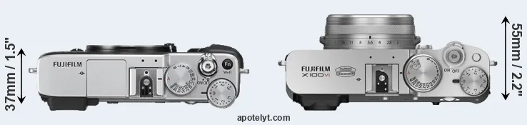 El tamaño físico y el peso de Fujifilm X-E2S y Fujifilm X100VI se ilustran en el siguiente gráfico. Las dos cámaras se muestran según su tamaño relativo. Todas las dimensiones están redondeadas al milímetro más cercano.