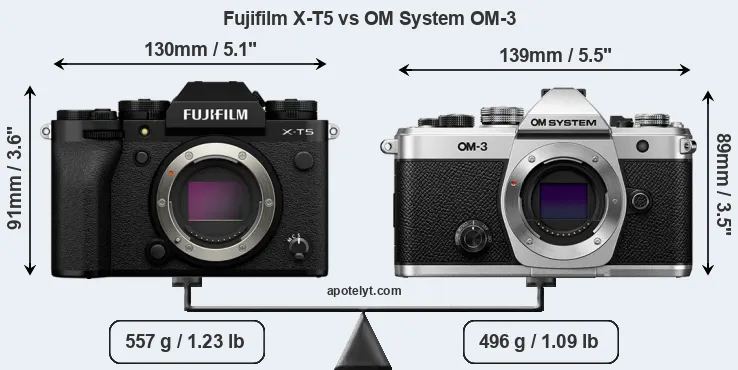 La Fujifilm X-T5 y la OM System OM-3 son dos cámaras digitales que fueron reveladas al público, respectivamente, en noviembre de 2022 y febrero de 2025. Ambas son cámaras cámara de objectivos intercambiables sin espejo, que están equipados con un sensor de fotograma APS-C (X-T5) y un sensor de cuatro tercios (OM-3). La Fujifilm tiene una resolución de 39,8 megapíxeles, mientras que la OM System proporciona 20,2 MP.