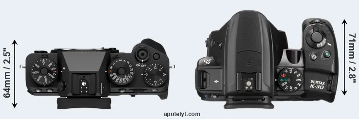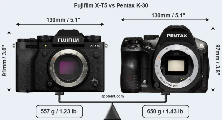 El tamaño físico y el peso de Fujifilm X-T5 y Pentax K-30 se ilustran en el siguiente gráfico. Las dos cámaras se muestran según su tamaño relativo. Todas las dimensiones están redondeadas al milímetro más cercano.