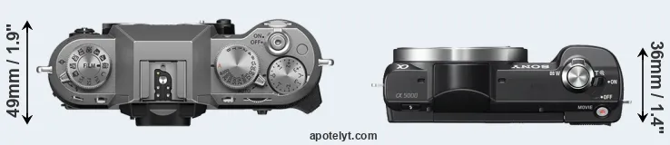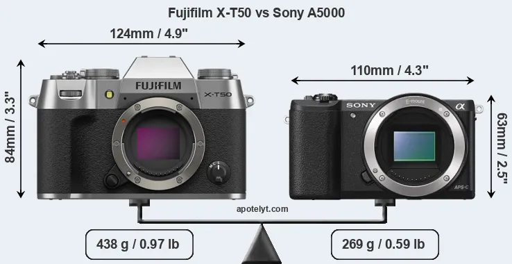 El tamaño físico y el peso de Fujifilm X-T50 y Sony A5000 se ilustran en el siguiente gráfico. Las dos cámaras se muestran según su tamaño relativo. Todas las dimensiones están redondeadas al milímetro más cercano.