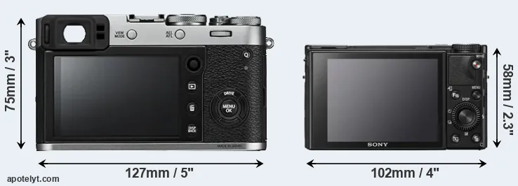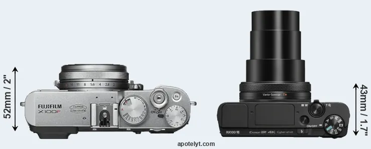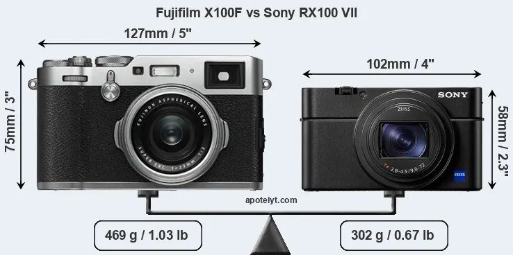 El tamaño físico y el peso de Fujifilm X100F y Sony RX100 VII se ilustran en el siguiente gráfico. Las dos cámaras se muestran según su tamaño relativo. Todas las dimensiones están redondeadas al milímetro más cercano.