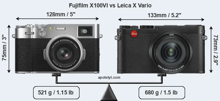 El tamaño físico y el peso de Fujifilm X100VI y Leica X Vario se ilustran en el siguiente gráfico. Las dos cámaras se muestran según su tamaño relativo. Todas las dimensiones están redondeadas al milímetro más cercano.