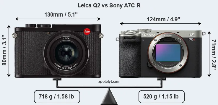 La Leica Q2 y la Sony Alpha A7C R son dos cámaras digitales que fueron reveladas al público, respectivamente, en marzo de 2019 y agosto de 2023. La Q2 es una cámara compacta con objectivo incorporada, mientras que la A7C R es una cámara de objectivos intercambiables sin espejo. Ambas cámaras están equipados con un sensor de fotograma completo. La Leica tiene una resolución de 46,7 megapíxeles, mientras que la Sony proporciona 60,2 MP.