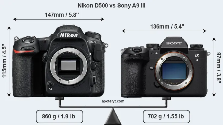 La Nikon D500 y la Sony Alpha A9 III son dos cámaras digitales que fueron reveladas al público, respectivamente, en enero de 2016 y noviembre de 2023. La D500 es una cámara DSLR, mientras que la A9 III es una cámara de objectivos intercambiables sin espejo.Las cámaras son equipados con un sensor de fotograma APS-C (D500) y un sensor de fotograma completo (A9 III). La Nikon tiene una resolución de 20,7 megapíxeles, mientras que la Sony proporciona 24,0 MP.
