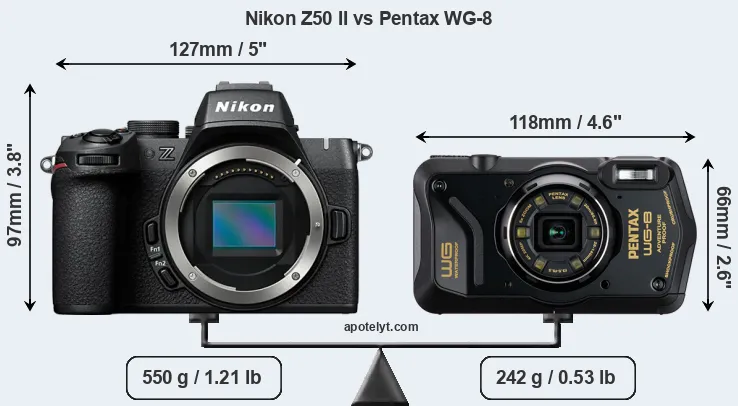 El tamaño físico y el peso de Nikon Z50 II y Pentax WG-8 se ilustran en el siguiente gráfico. Las dos cámaras se muestran según su tamaño relativo. Todas las dimensiones están redondeadas al milímetro más cercano.