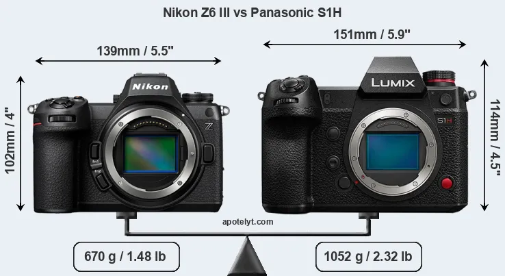 El tamaño físico y el peso de Nikon Z6 III y Panasonic S1H se ilustran en el siguiente gráfico. Las dos cámaras se muestran según su tamaño relativo. Todas las dimensiones están redondeadas al milímetro más cercano.
