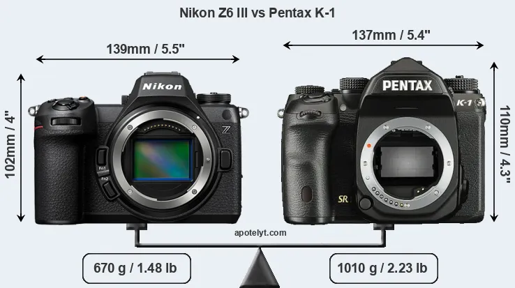 El tamaño físico y el peso de Nikon Z6 III y Pentax K-1 se ilustran en el siguiente gráfico. Las dos cámaras se muestran según su tamaño relativo. Todas las dimensiones están redondeadas al milímetro más cercano.