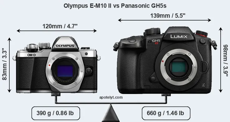 El tamaño físico y el peso de Olympus E-M10 II y Panasonic GH5s se ilustran en el siguiente gráfico. Las dos cámaras se muestran según su tamaño relativo. Todas las dimensiones están redondeadas al milímetro más cercano.