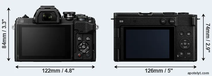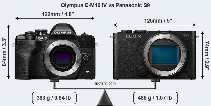 El tamaño físico y el peso de Olympus E-M10 IV y Panasonic S9 se ilustran en el siguiente gráfico. Las dos cámaras se muestran según su tamaño relativo. Todas las dimensiones están redondeadas al milímetro más cercano.