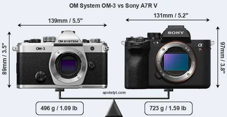 La OM System OM-3 y la Sony Alpha A7R V son dos cámaras digitales que fueron reveladas al público, respectivamente, en febrero de 2025 y octubre de 2022. Ambas son cámaras cámara de objectivos intercambiables sin espejo, que están equipados con un sensor de cuatro tercios (OM-3) y un sensor de fotograma completo (A7R V). La OM System tiene una resolución de 20,2 megapíxeles, mientras que la Sony proporciona 60,2 MP.