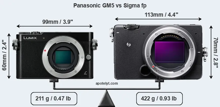 La Panasonic Lumix DMC-GM5 y la Sigma fp son dos cámaras digitales que fueron reveladas al público, respectivamente, en septiembre de 2014 y julio de 2019. Ambas son cámaras cámara de objectivos intercambiables sin espejo, que están equipados con un sensor de cuatro tercios (GM5) y un sensor de fotograma completo (fp). La Panasonic tiene una resolución de 15,8 megapíxeles, mientras que la Sigma proporciona 24,0 MP.